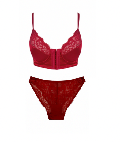 The Valora Burgundy Lingerie Set features a delicate contrast lace design with a romantic French-inspired style. The front-close underwire bra provides high support, while the adjustable straps ensure a comfortable fit.